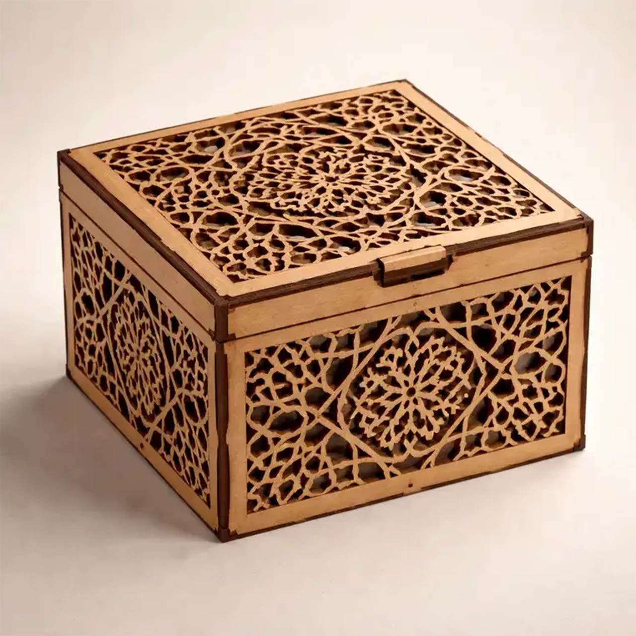 باکس هدیه تبلیغاتی با برش لیزر یک جعبه جذاب و حرفهای است که با استفاده از دستگاه لیزر، با دقت بالا و لبههای بسیار تمیز تولید میشود. این باکسها معمولاً از متریالهایی مانند چوب، امدیاف، پلکسی یا مقواهای خاص ساخته میشوند و امکان ایجاد طرحهای پیچیده، لوگو، نام برند یا نقشهای تزیینی روی آنها وجود دارد.